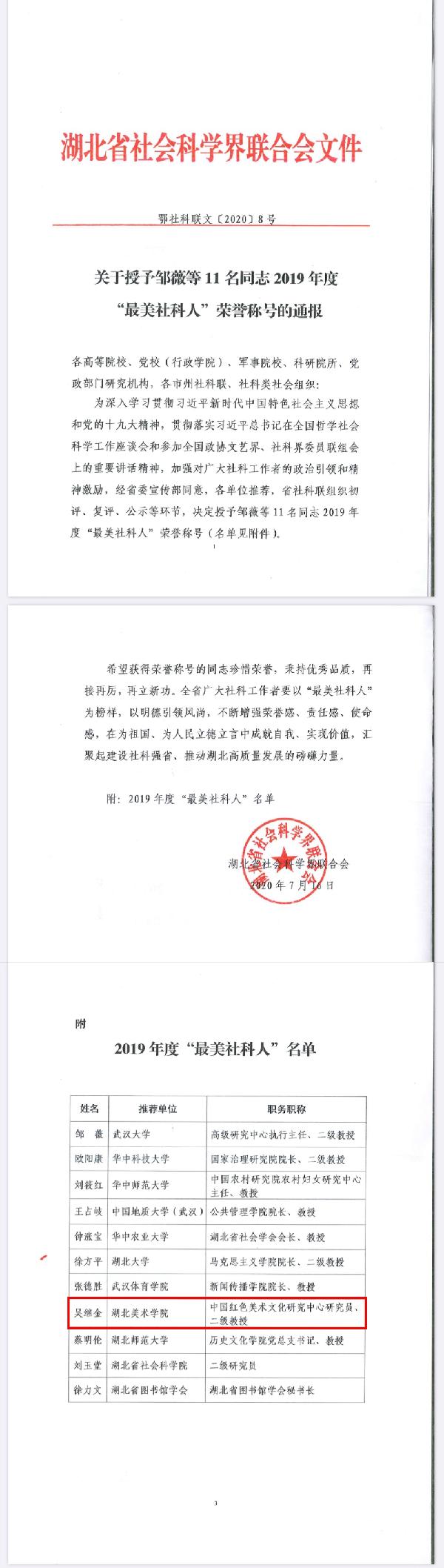 本网讯(通讯员 小筱)近日,湖北省社会科学界联合会印发了《关于授予邹薇等11名同志2019年度“最美社科人”荣誉称号的通报》(鄂社科联文〔2020〕8号),公布了11位2019年度湖北省最美社科人名单,公司bw必威西汉姆联官方网站吴继金教授上榜,被授予“最美社科人”荣誉称号。