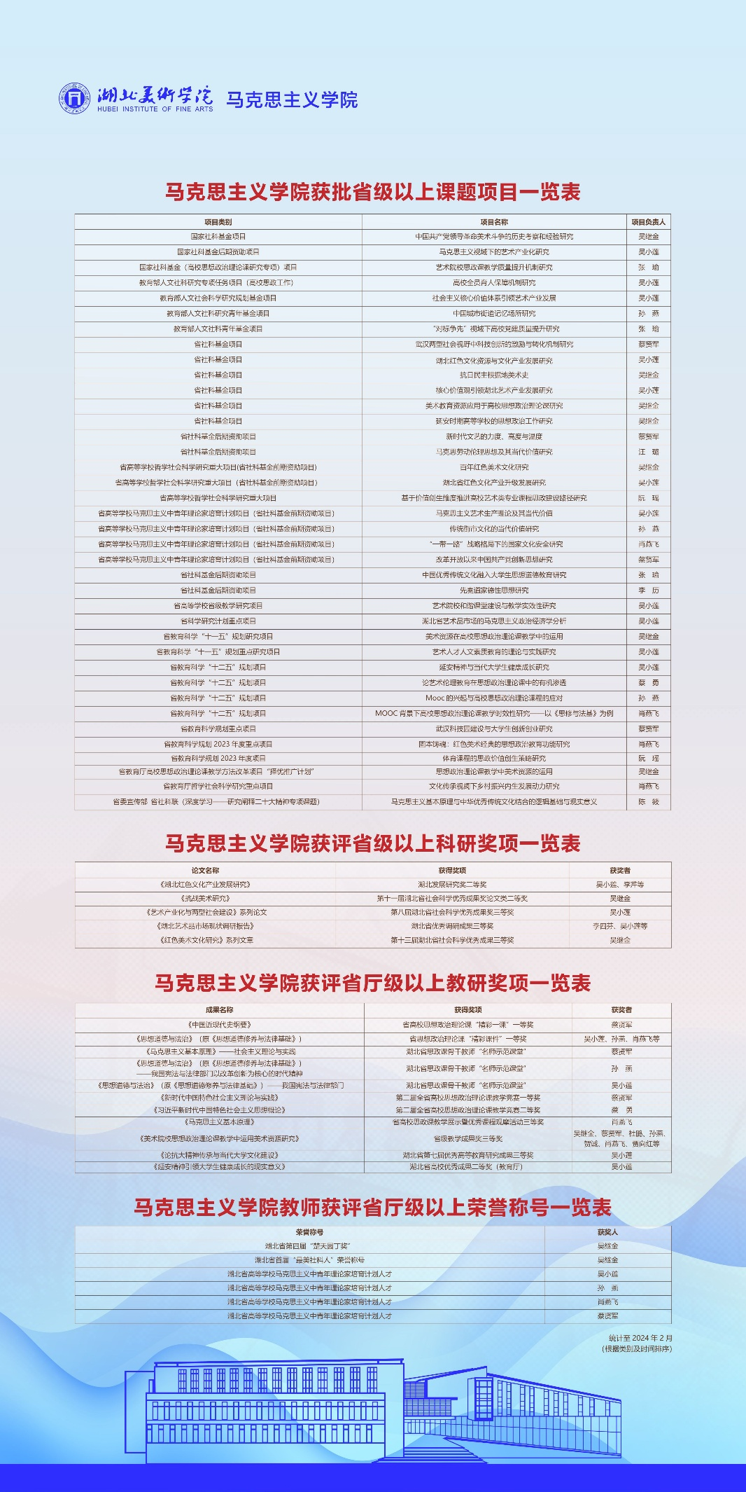 公司深入开展理论研究,充分发挥“智库”功能,以丰硕的科研教研成果为教学改革蓄力。获得国家社科基金项目3项、教育部研究项目4项、湖北省社科基金项目12项、湖北省教育科学规划项目11项等多项资助;获批湖北省高等公司哲学社会科学研究重大项目和马克思主义中青年理论家培育计划项目多项。此外,公司公开发表论文53篇,其中CSSCI来源论文19篇,出版专著14部,涵盖马克思主义理论、红色美术文化及习近平新时代中国特色社会主义思想等领域,为学术界提供了宝贵的研究资源。