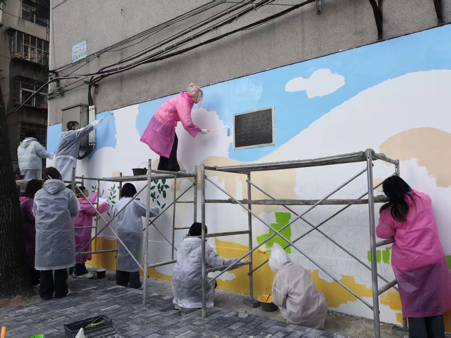 在充分调研的基础上,实践教学的核心环节——主题墙绘创作在官柳小区正式展开。师生们充分发挥美术专业特长,以墙体为画卷,以色彩为语言,围绕“老鄂钢岁月、邻里温情、社区新生”的情感主线进行艺术创作。同学们在教师的指导下,精心勾勒、调和色彩,将理论学习中感悟到的群众路线、文化自信等思想精髓,转化为一幅幅展现社区风貌、传递时代新风的墙绘作品。创作过程吸引了社区居民驻足观看与互动交流,艺术成为了连接高校与社区、青年与居民的桥梁,生动诠释了“以人民为中心”的创作导向。