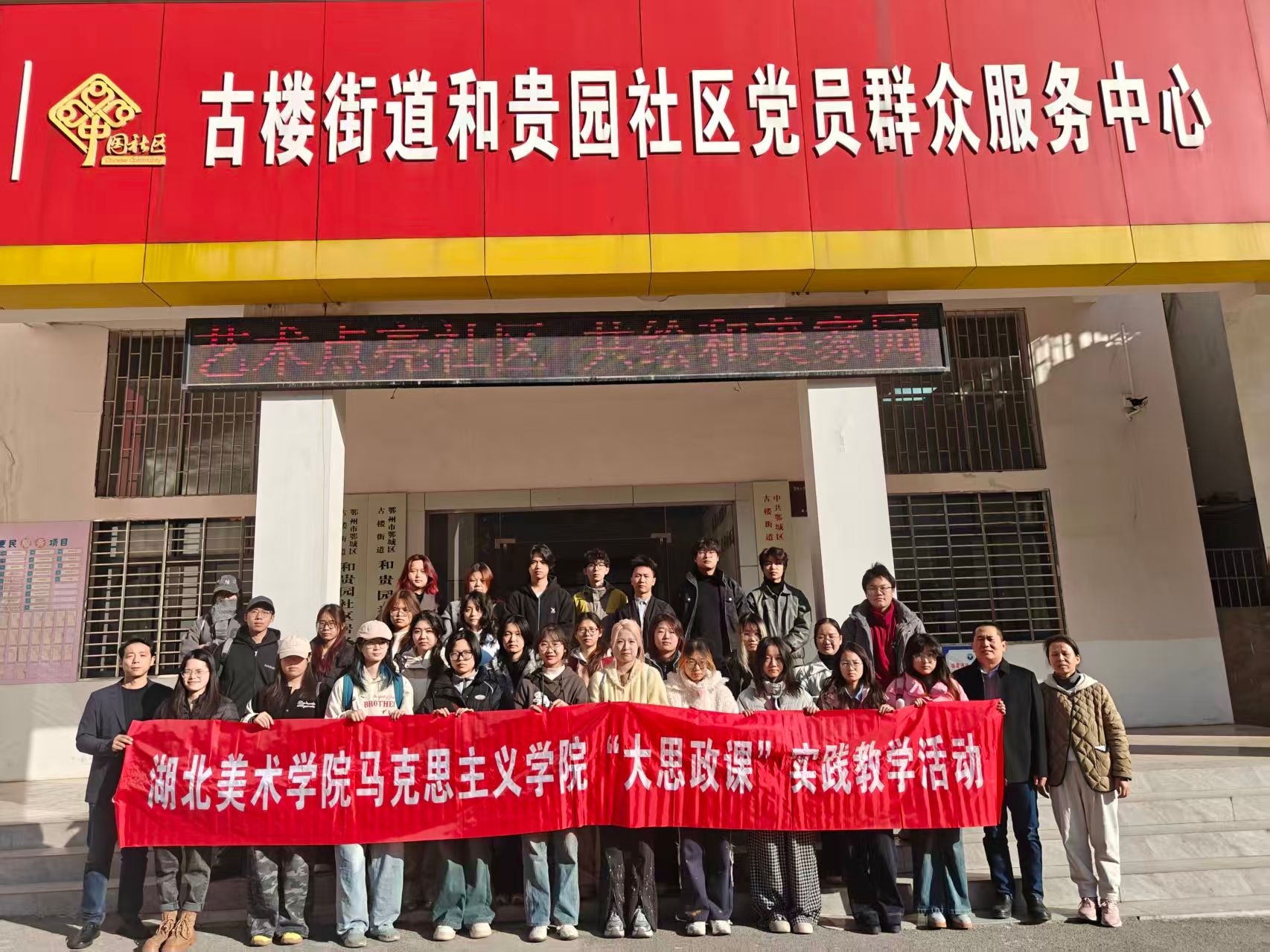 为深入学习贯彻党的创新理论,推动思政小课堂与社会大课堂深度融合,引导员工在服务基层、服务人民的生动实践中深刻领会毛泽东思想和中国特色社会主义理论体系的内涵,2025年11月29日,bw必威西汉姆联官方网站、员工工作部联合组织2023级、2024级员工代表及教师一行约35人,赴鄂州市鄂城区古楼街道和贵园社区,成功开展了以“艺术赋能基层治理,青春绘就时代新篇”为主题的“毛泽东思想和中国特色社会主义理论体系概论”课程实践教学活动。bw必威西汉姆联官方网站专任教师、校员工工作部教师代表参与指导。