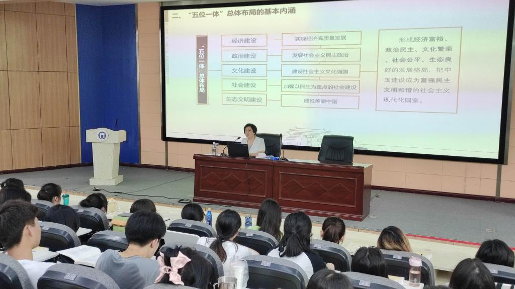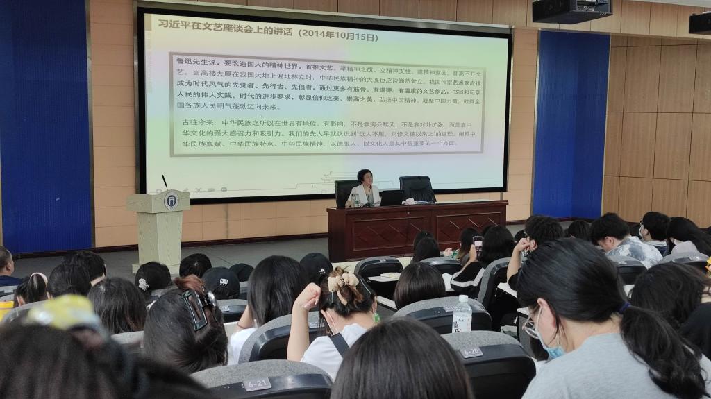 鲍书记以“‘五位一体’总体布局之——文化建设”为题,结合典型案例和经典美术作品赏析,以广阔的理论视野和清晰的论证逻辑,深入阐释了中国特色社会主义事业“五位一体”总体布局的基本内涵和文化建设在总体布局中的地位。其间,她为同学们详细解读了毛泽东同志1942年在延安文艺座谈会上的讲话和习近平总书记2014年在文艺工作座谈会上的讲话,并强调“文化是一个国家、一个民族的灵魂;文化兴国运兴,文化强民族强”。
