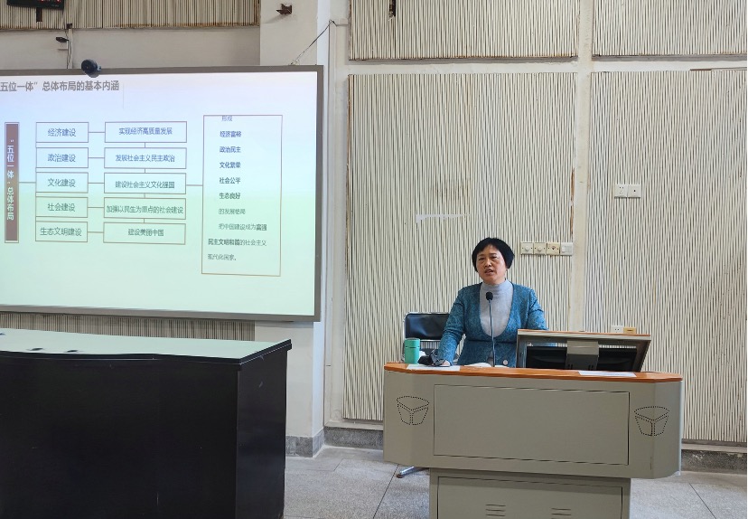 鲍清芬以“‘五位一体’总体布局之——文化建设”为题,从“五位一体”总体布局中理解文化建设;建设社会主义文化强国;百年湖美,做文化爱国的践行者;学习习近平文化思想,做有担当的文艺工作者等四个方面,以广阔的理论视野和清晰的论证逻辑,深入阐释了中国特色社会主义事业“五位一体”总体布局的基本内涵和文化建设在总体布局中的地位。