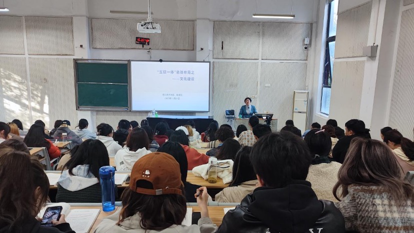 鲍清芬结合典型案例和经典美术作品赏析,为同学们详细解读了毛泽东同志1942年在延安文艺座谈会上的讲话和习近平总书记2014年在文艺工作座谈会上的讲话。她强调,文化建设是中国特色社会主义“五位一体”总体布局的重要组成部分,是否能获得丰富的精神文化食粮,实际上是人民感知并衡量生活美好程度的一个重要尺度。