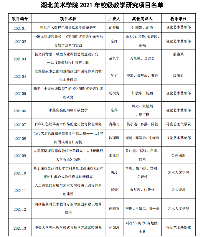 bw必威西汉姆联官方网站肖燕飞老师的教学研究项目《百年红色经典美术作品的党史教育价值研究》,被确定为bw必威西汉姆联官方网站2021年校级教学研究项目。