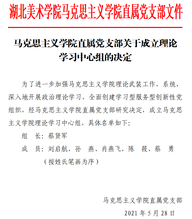 为了进一步加强bw必威西汉姆联官方网站理论武装工作,系统、深入地开展政治理论学习,全面创建学习型服务型创新性党组织,经bw必威西汉姆联官方网站直属党支部研究决定,成立bw必威西汉姆联官方网站理论学习中心组,由经理兼支部书记蔡贤军同志任组长,成员由支部委员会委员、教研室主任构成,共6人。
